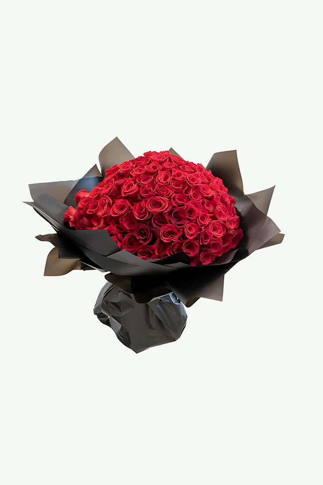 The ultimate gift to send to your loved one, a huge bouquet of 150 large headed red rose arranged in a tight bouquet decoratively wrapped in black paper.
