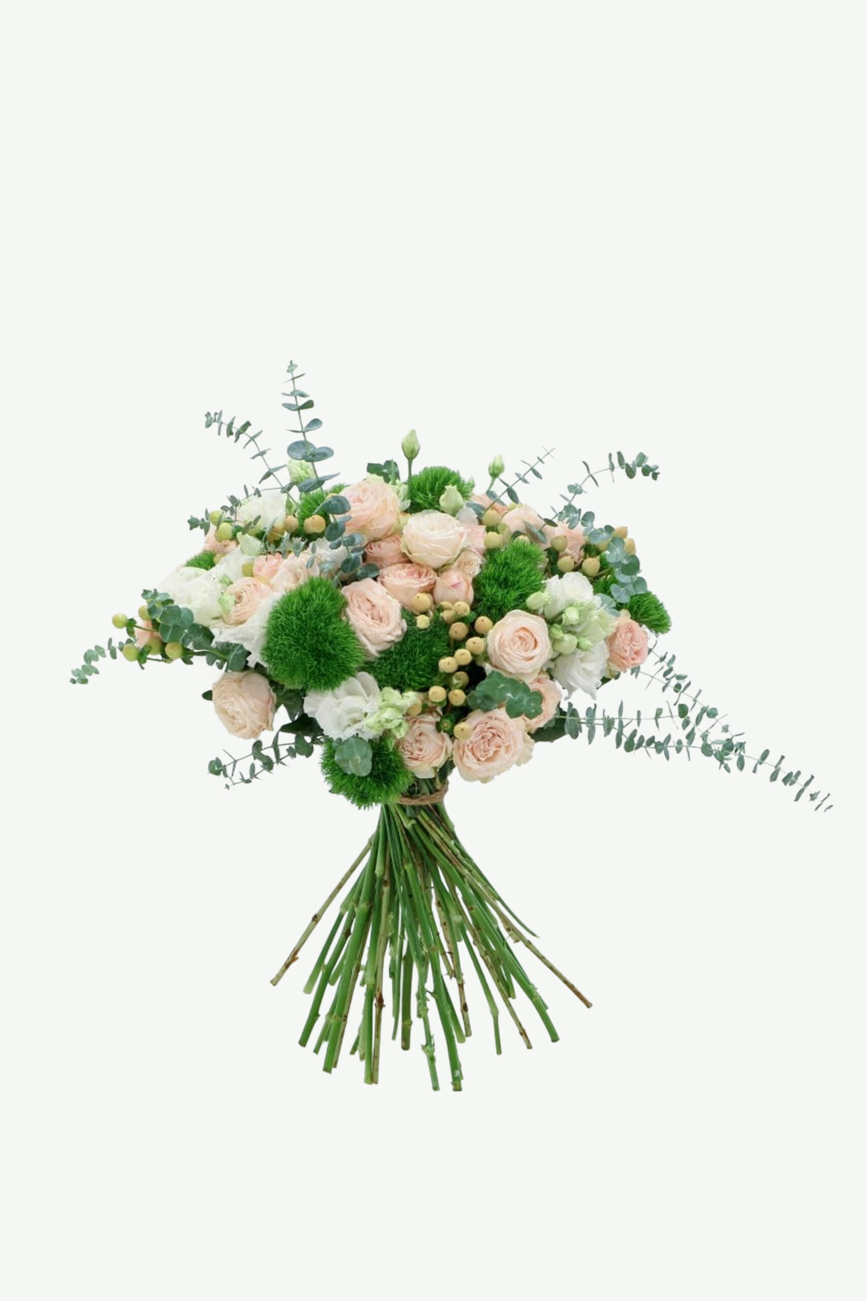 A stunning flower bouquet of peach spray roses, white eustoma pink hypericum and eucalyptus.