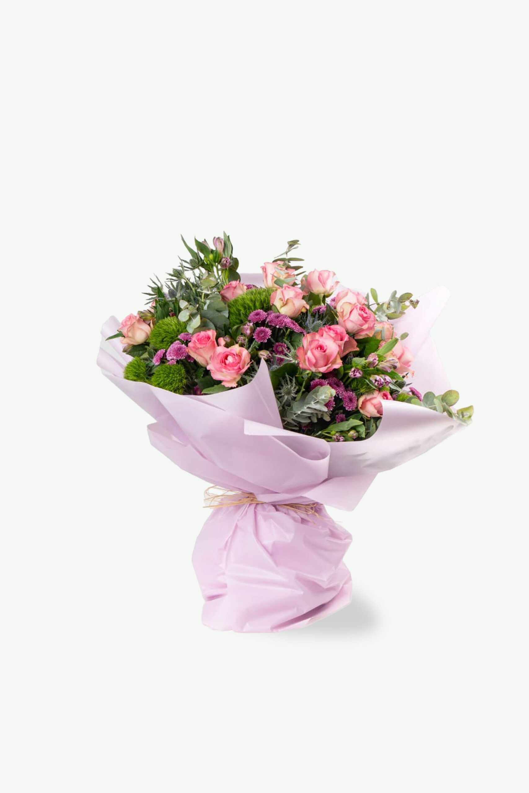 Discover our captivating bouquet featuring a harmonious blend of roses, eryngium, alstroemeria, eucalyptus, and more. Each bloom is carefully selected to create a stunning arrangement that radiates beauty and charm. Perfect for any occasion, it evokes feelings of joy and admiration, leaving a lasting impression on recipients.